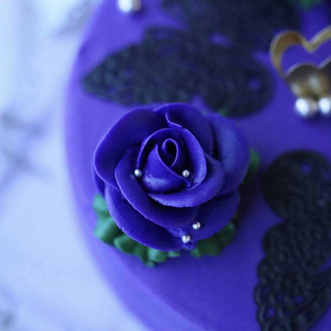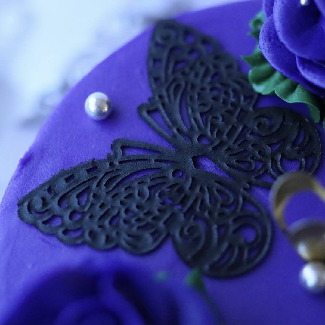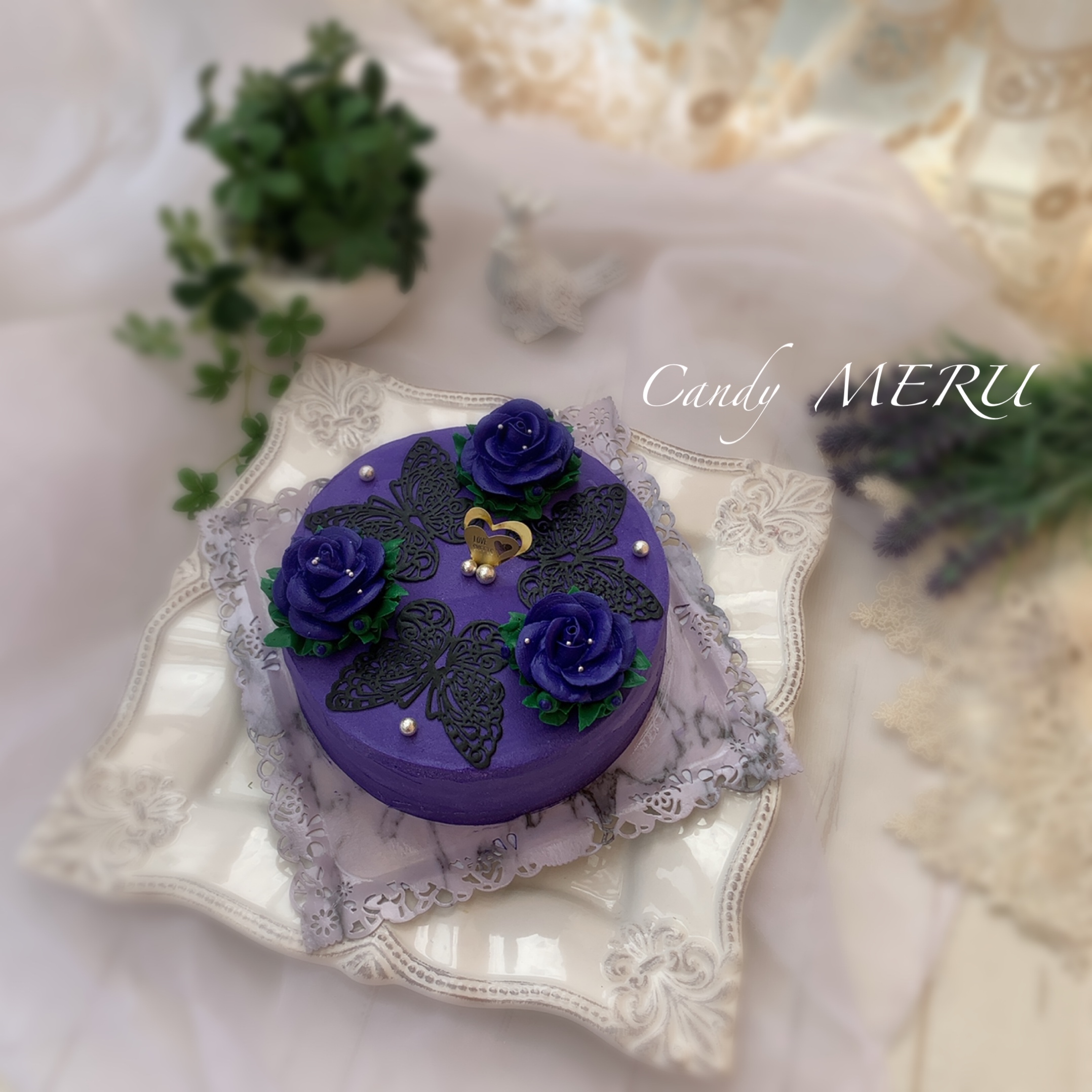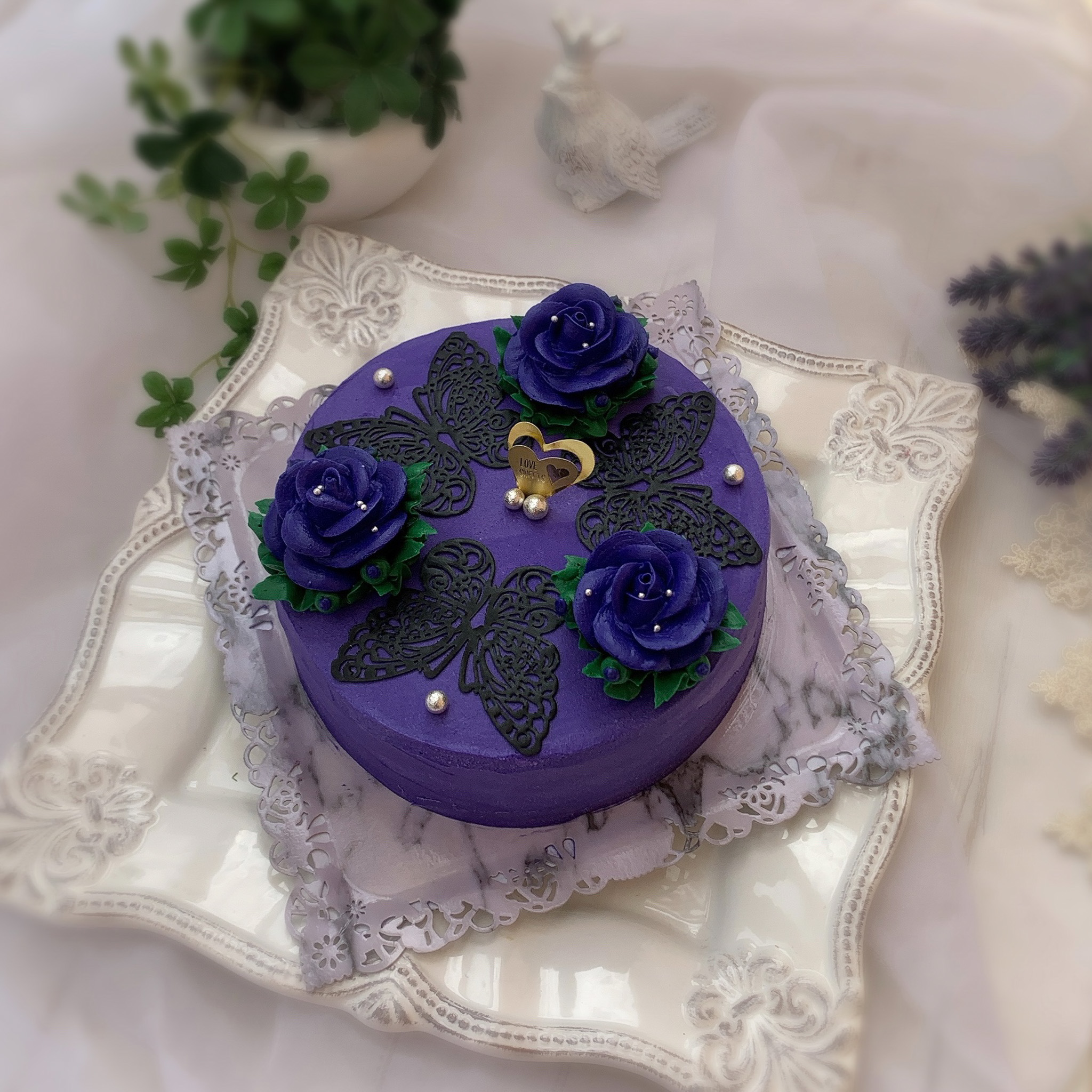 『誇り・気品・上品』といった花言葉を持つ紫のバラと黒い蝶の、シックで神秘的なデザインのケーキです。大人っぽさやクールな雰囲気がお好きな方におすすめです。
