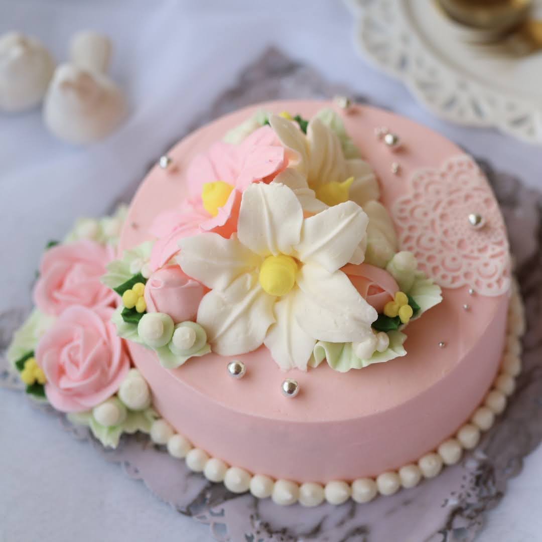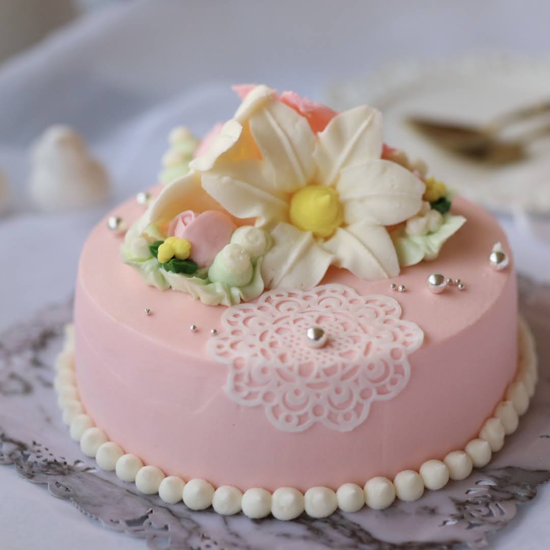 ピンクと白のカサブランカとパールのシンプルな、上品で美しいケーキです。