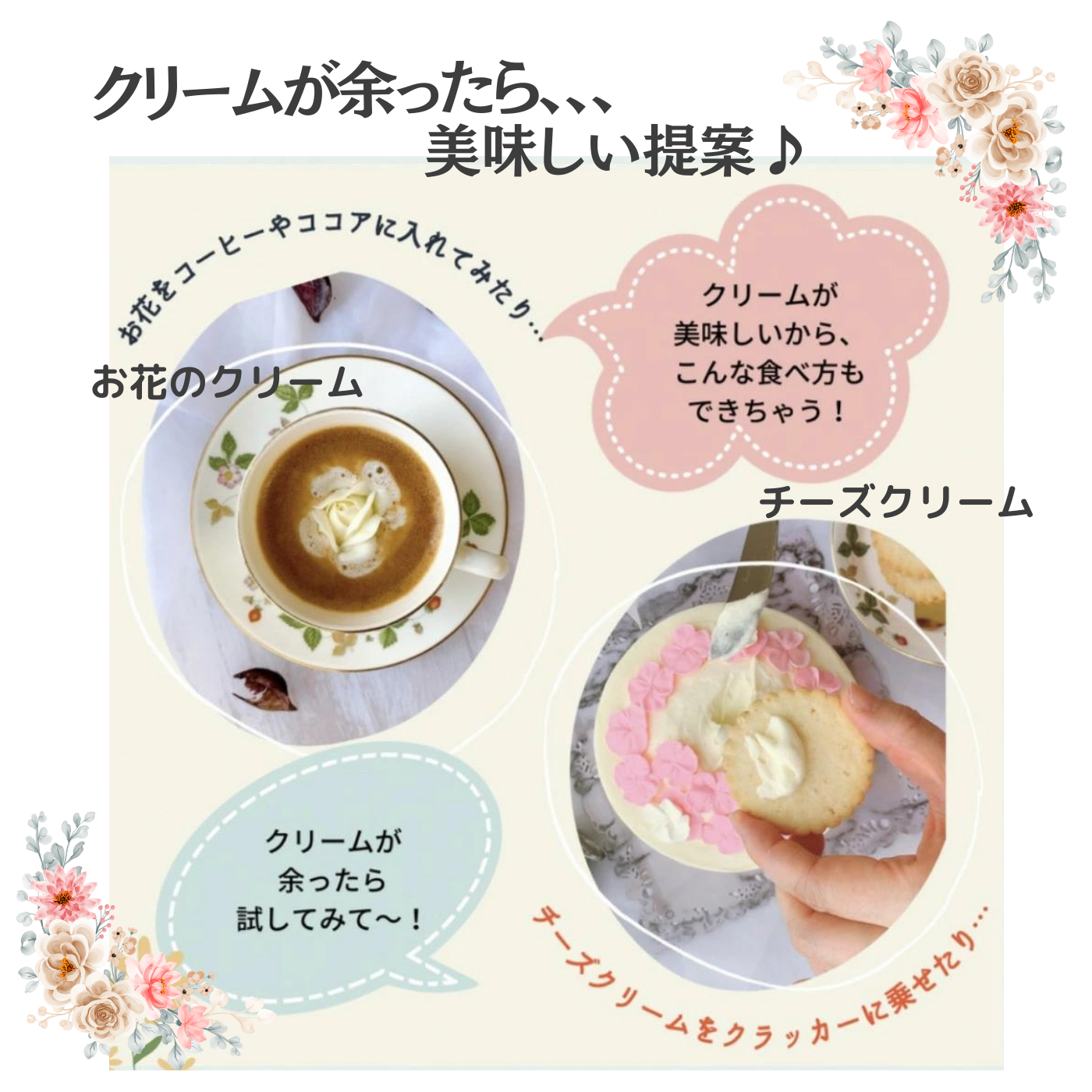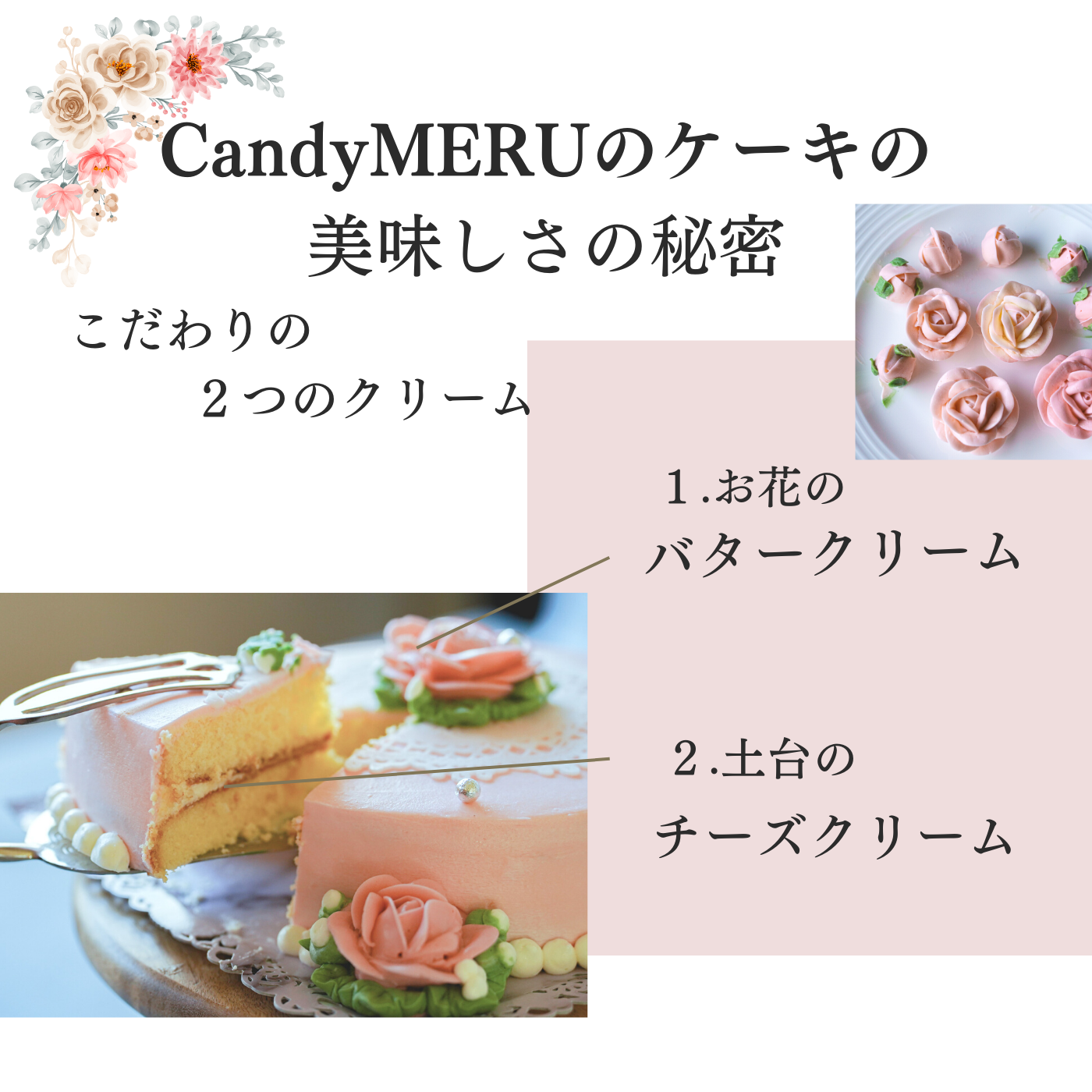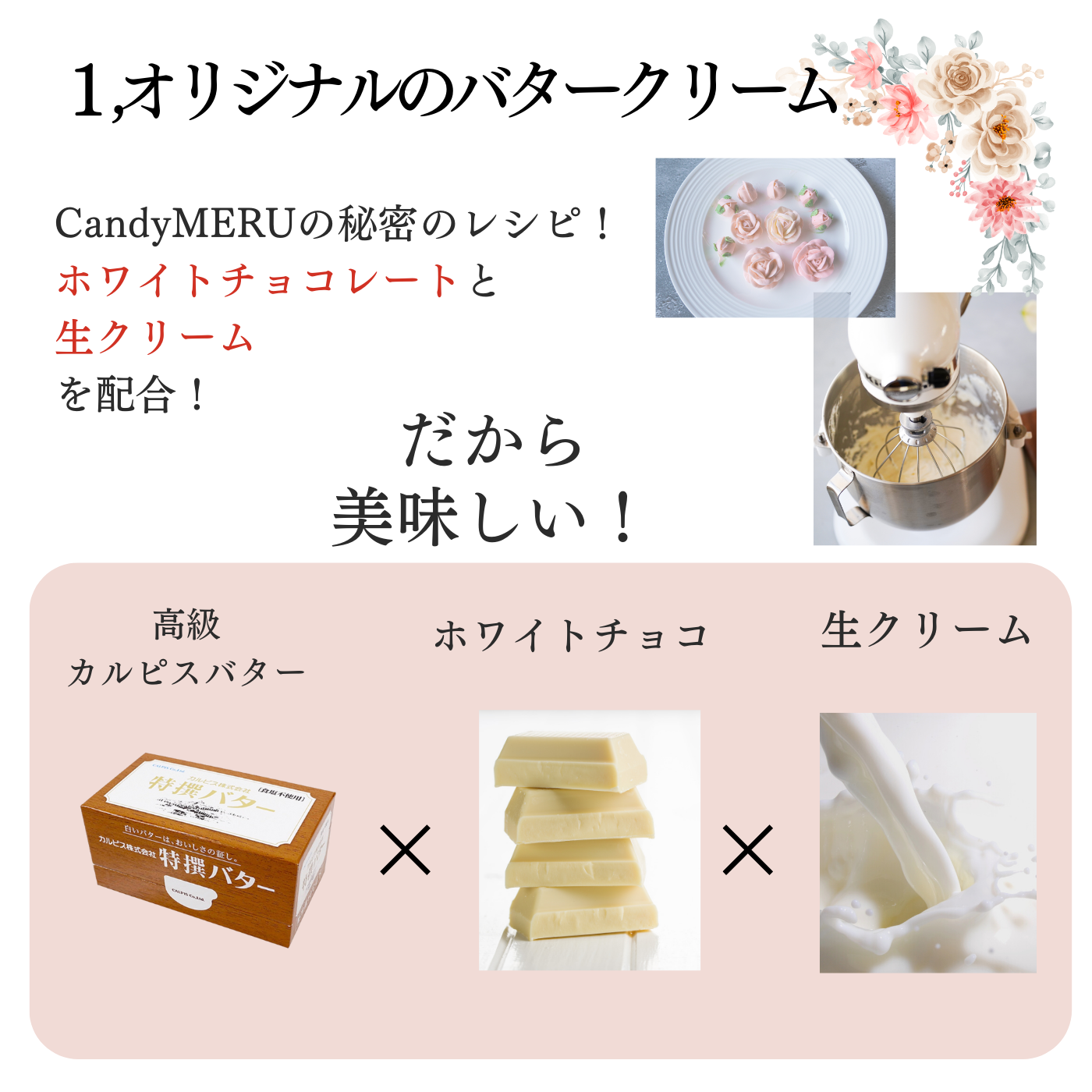 食べられる花束にびっくりされること、間違いなしです。高級カルピスバターにホワイトチョコレートと生クリームを合わせて作った、オリジナルのバタークリームです。