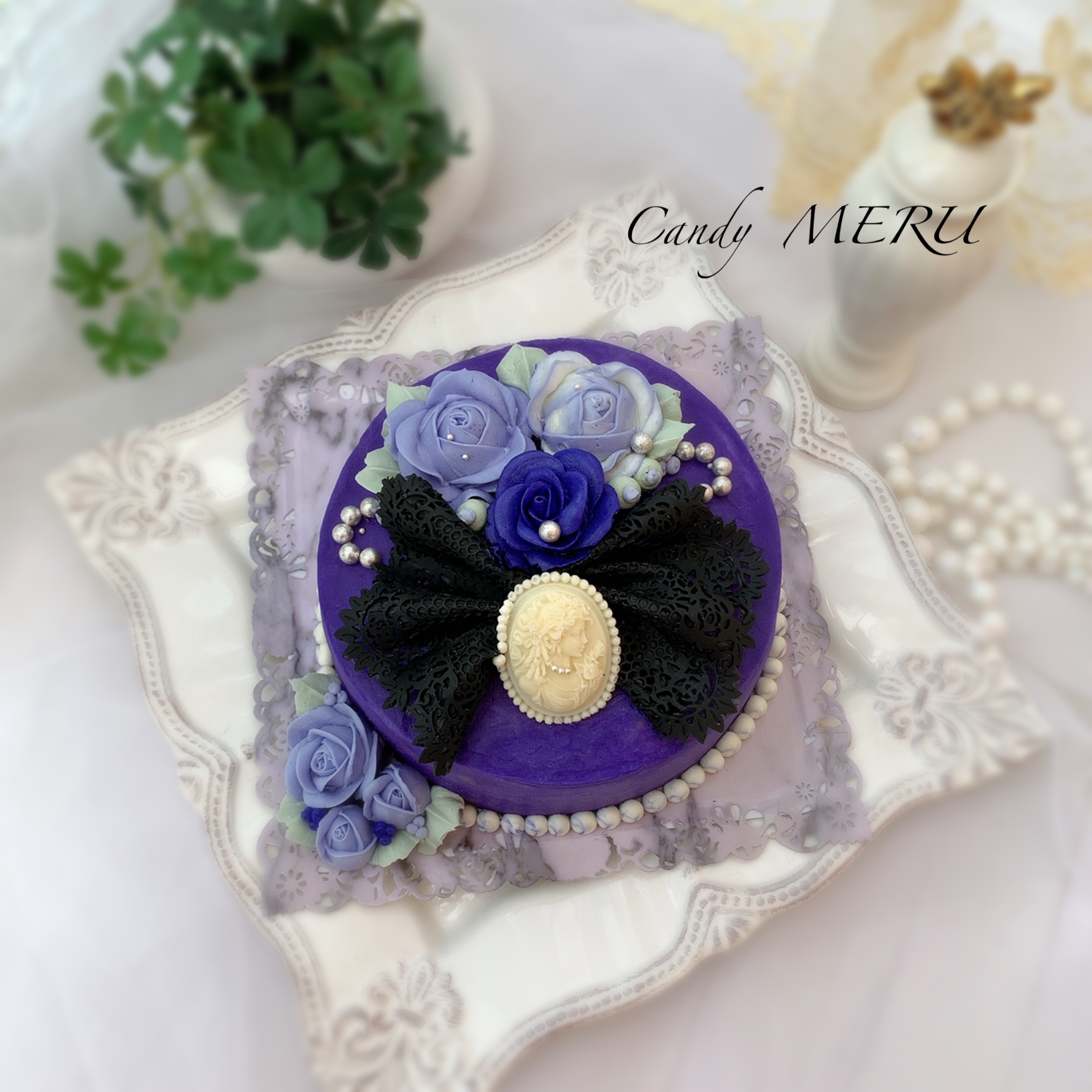 ブラックリボンと紫のバラのフラワーケーキ(チーズケーキ味)