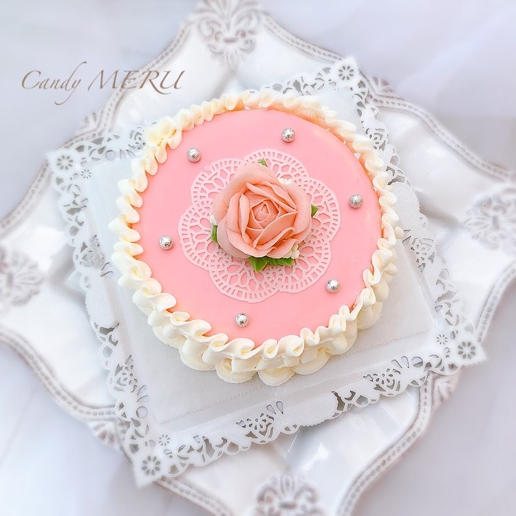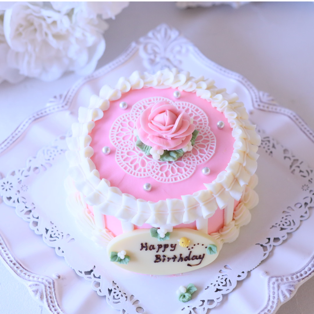 (北海道、沖縄除く)アンティークローズと白いフリルが可愛いケーキです。