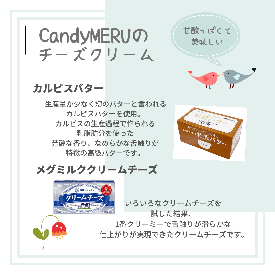 2~3人の少人数でのお祝いにちょうどいい小さなケーキです。萌黄色のケーキはチーズクリームでスポンジを包み、ブルベリー味またはレモン味のチーズクリームを挟んで、チーズケーキのような味わいになっています。